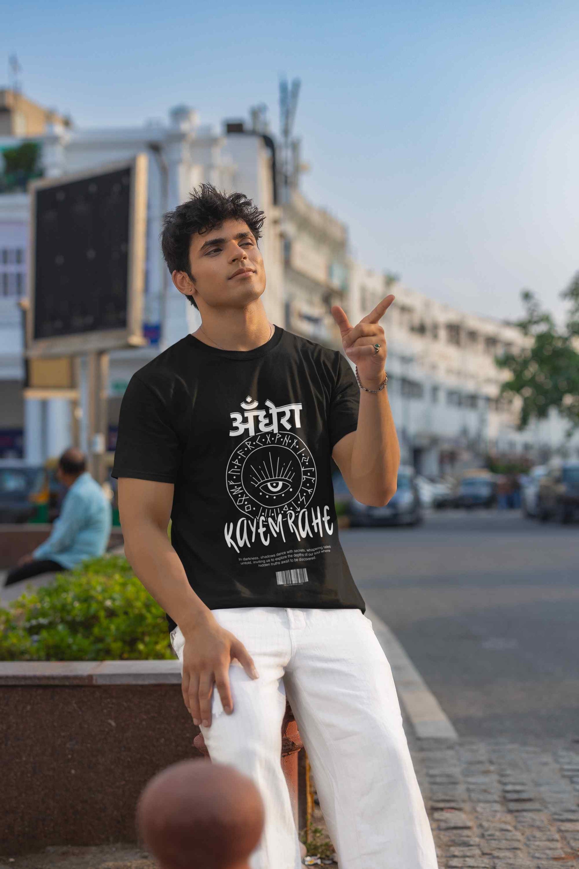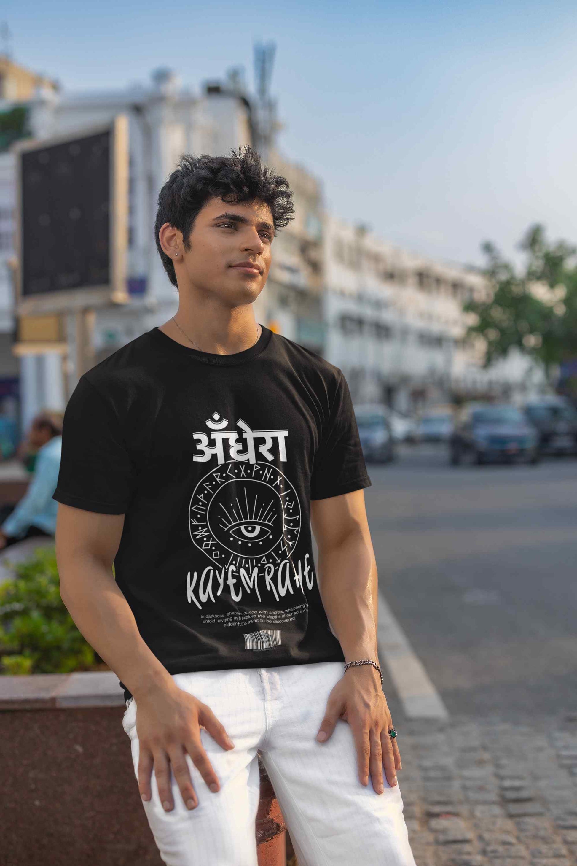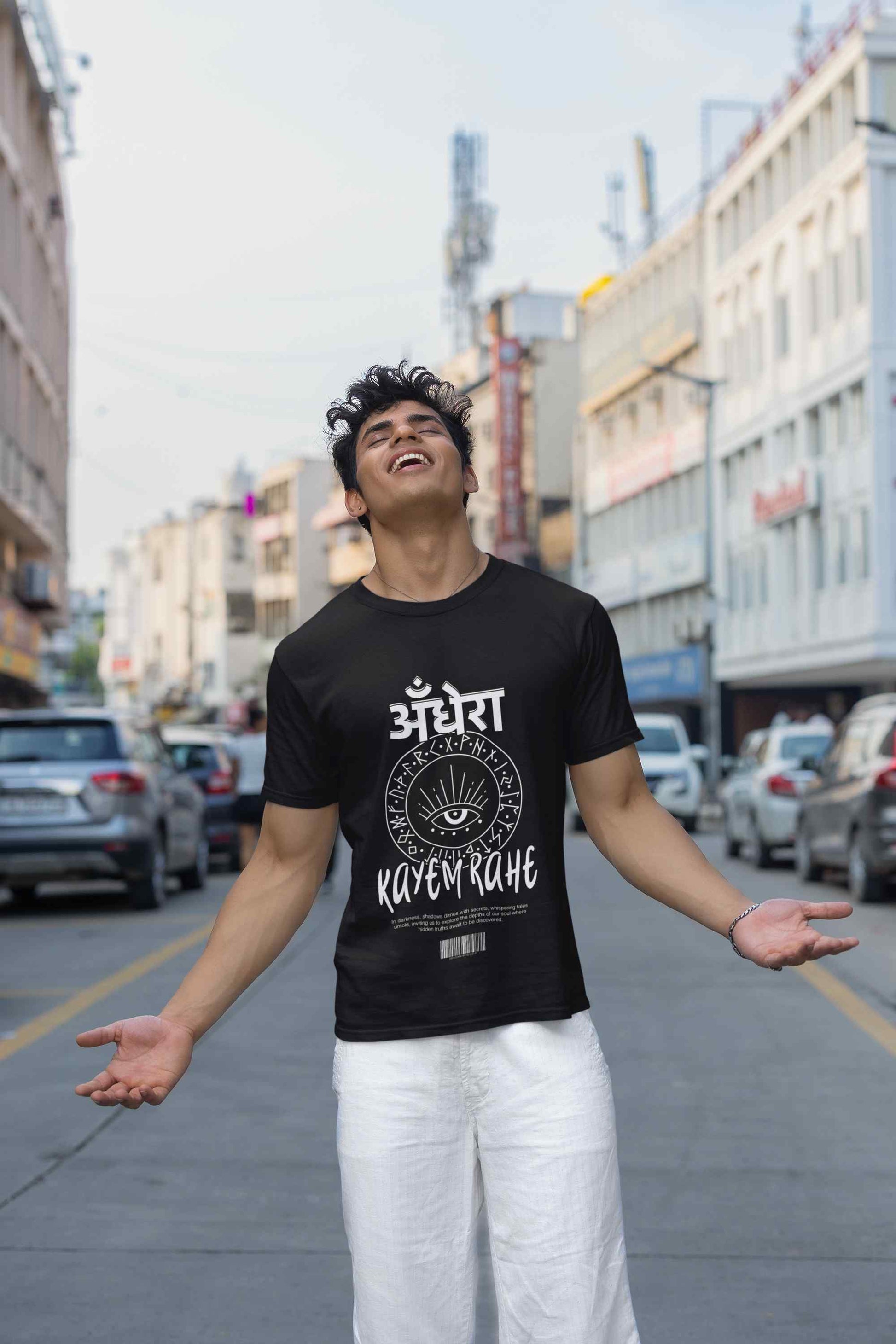 Upgrade your wardrobe with our Andhera Printed Basic T Shirt. Celebrate the essence of Indian culture with Mayavarta's Desi Deals collection. Our fun and vibrant designs capture the spirit of India, perfect for those who love to showcase their heritage. Explore our unique and playful clothing that adds a touch of desi charm to your wardrobe.