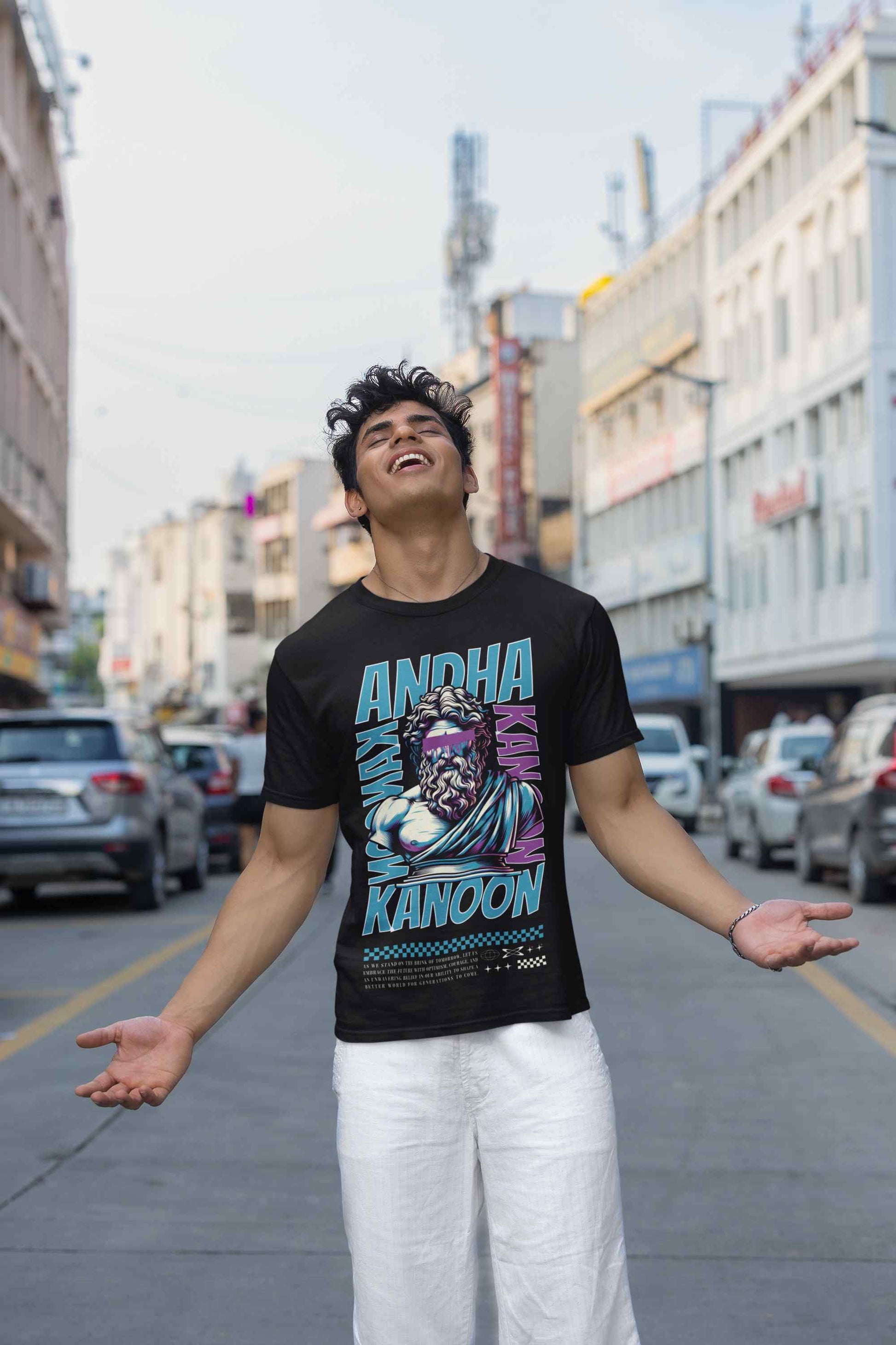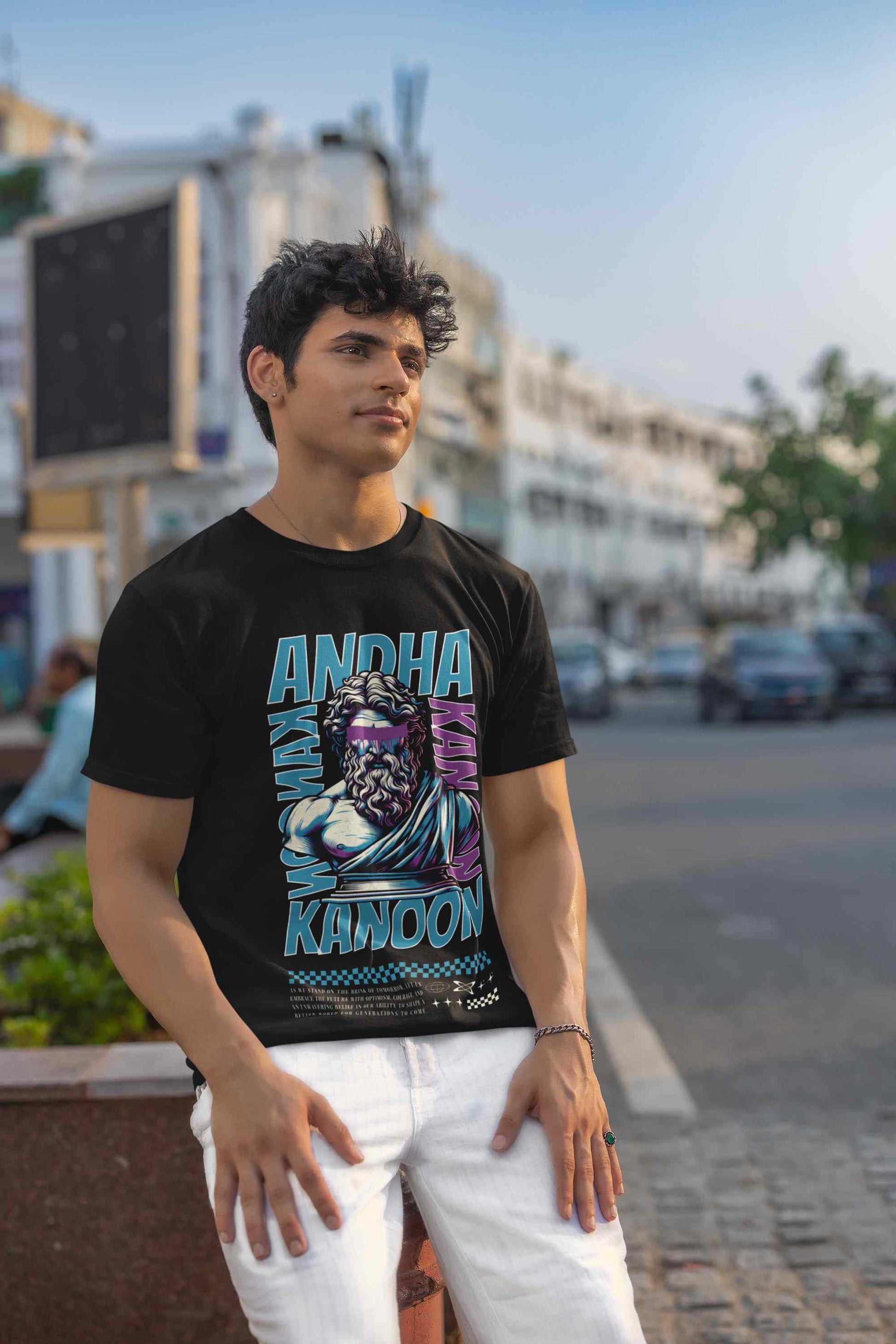 Upgrade your wardrobe with our Blind Law Printed T Shirt. Celebrate the essence of Indian culture with Mayavarta's Desi Deals collection. Our fun and vibrant designs capture the spirit of India, perfect for those who love to showcase their heritage. Explore our unique and playful clothing that adds a touch of desi charm to your wardrobe.