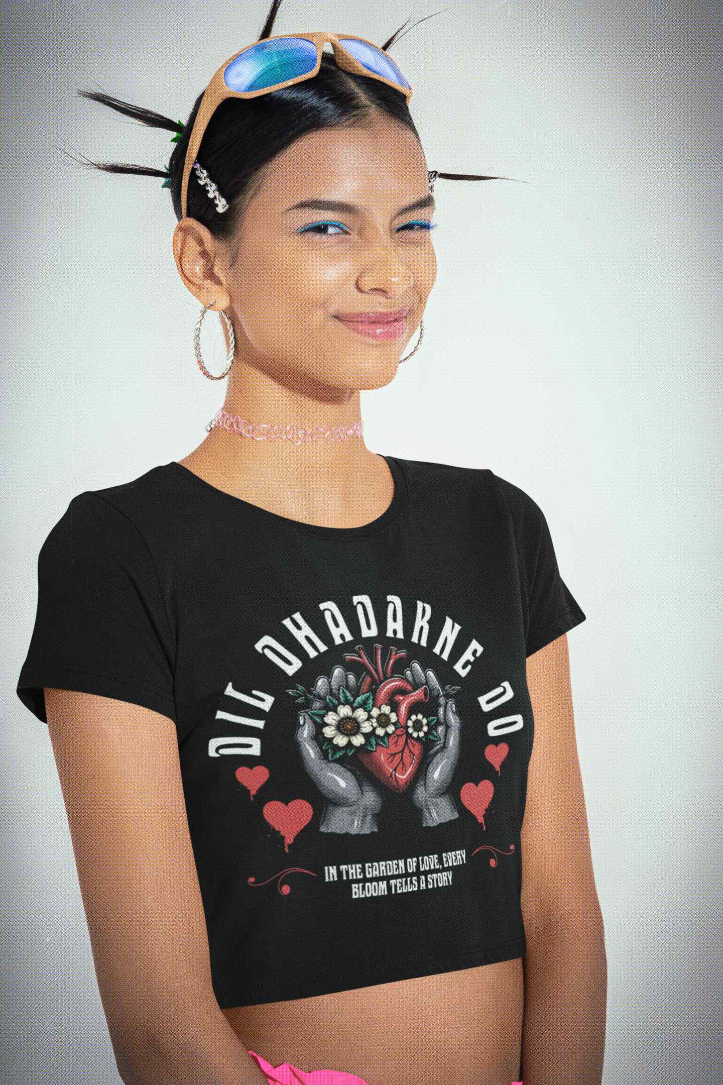 Make a statement with the Dil Dhadakne Do Crop Top. Celebrate the essence of Indian culture with Mayavarta's Desi Deals collection. Our fun and vibrant designs capture the spirit of India, perfect for those who love to showcase their heritage. Explore our unique and playful clothing that adds a touch of desi charm to your wardrobe.