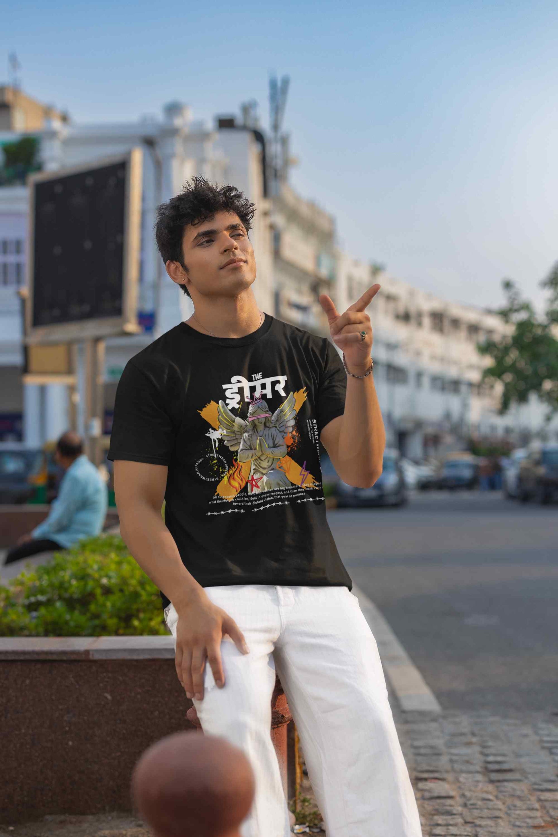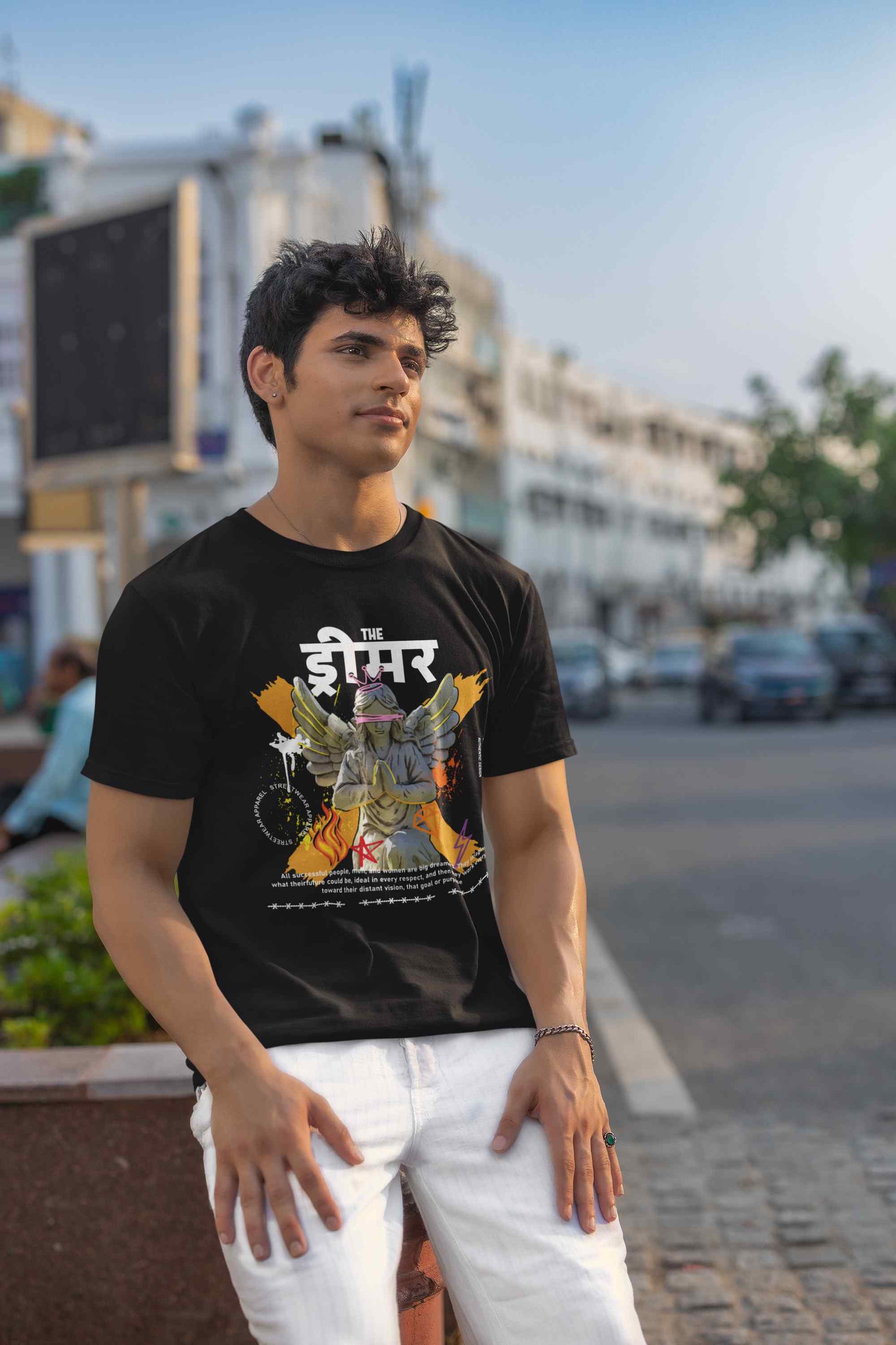 Upgrade your wardrobe with our Dreamer Printed T shirt. Celebrate the essence of Indian culture with Mayavarta's Desi Deals collection. Our fun and vibrant designs capture the spirit of India, perfect for those who love to showcase their heritage. Explore our unique and playful clothing that adds a touch of desi charm to your wardrobe.