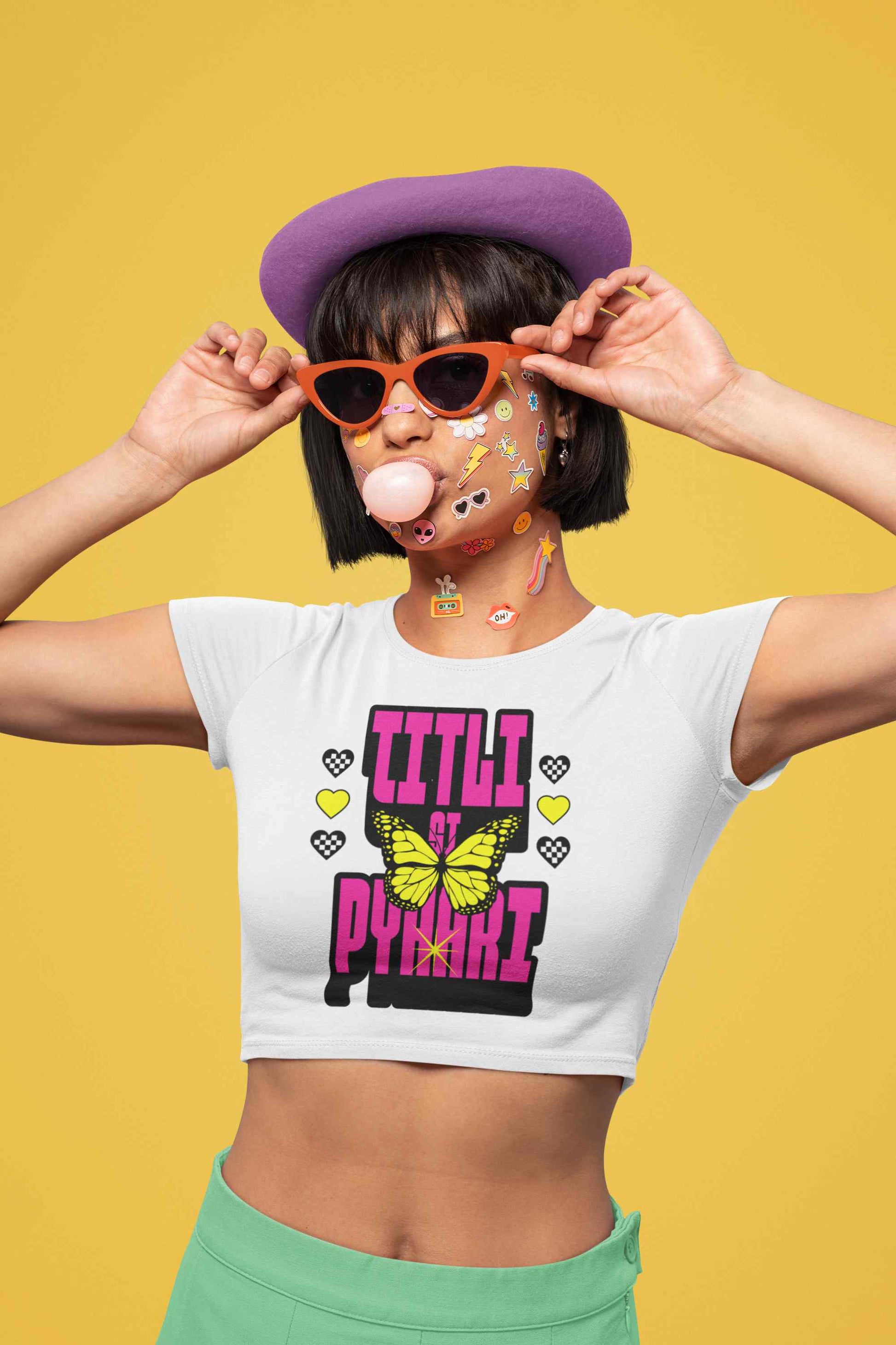 Make a statement with the Pyari titli printed Crop Tee. Celebrate the essence of Indian culture with Mayavarta's Desi Deals collection. Our fun and vibrant designs capture the spirit of India, perfect for those who love to showcase their heritage. Explore our unique and playful clothing that adds a touch of desi charm to your wardrobe.