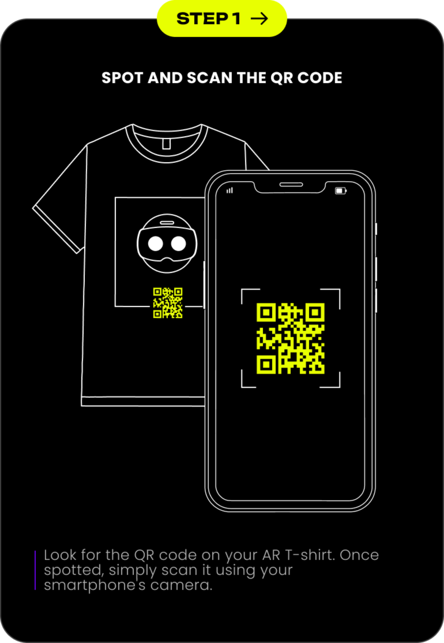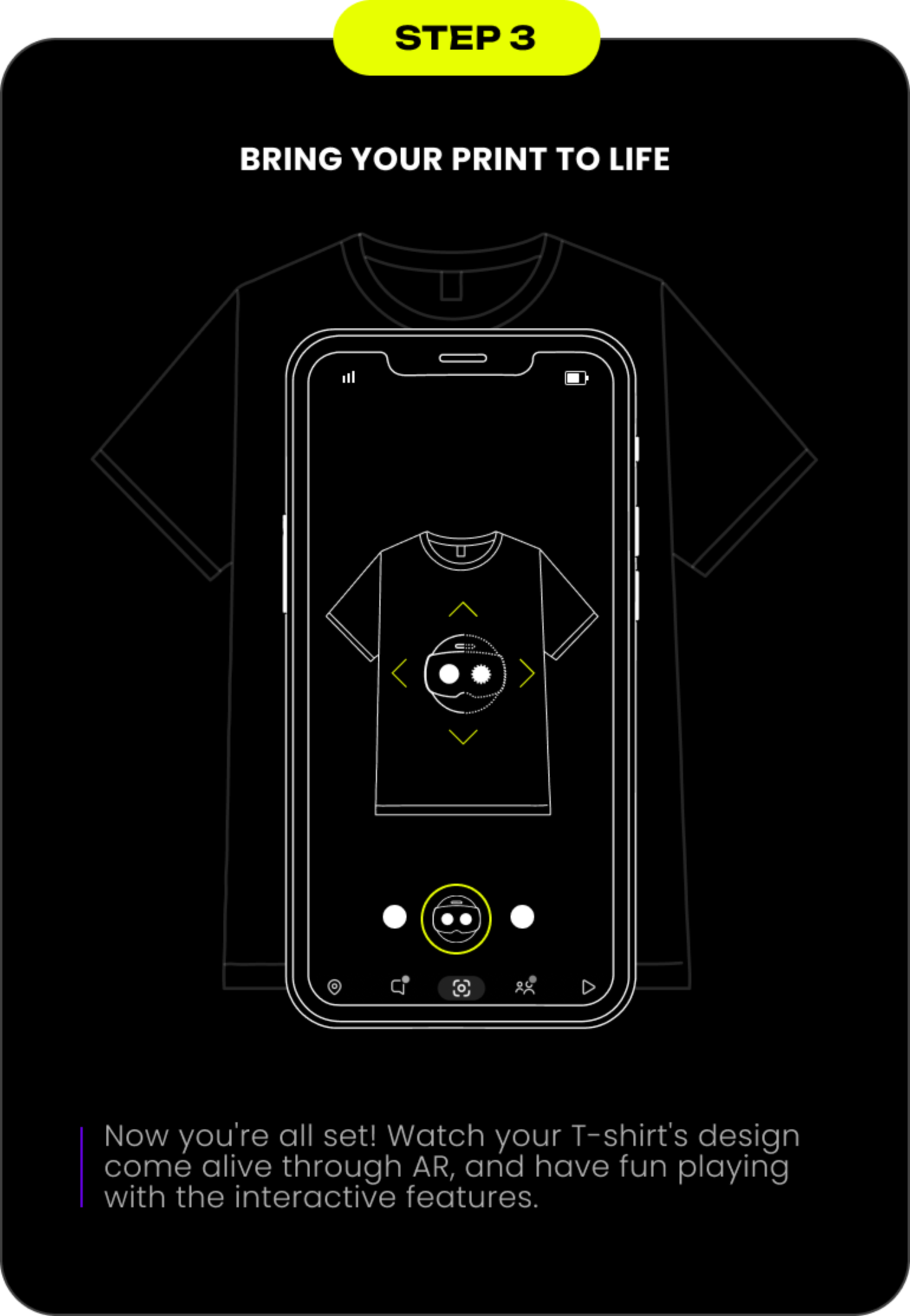 Transforms your clothing’s front into a dynamic screen. Scan the AR code to see animated graphics and motion designs come alive!